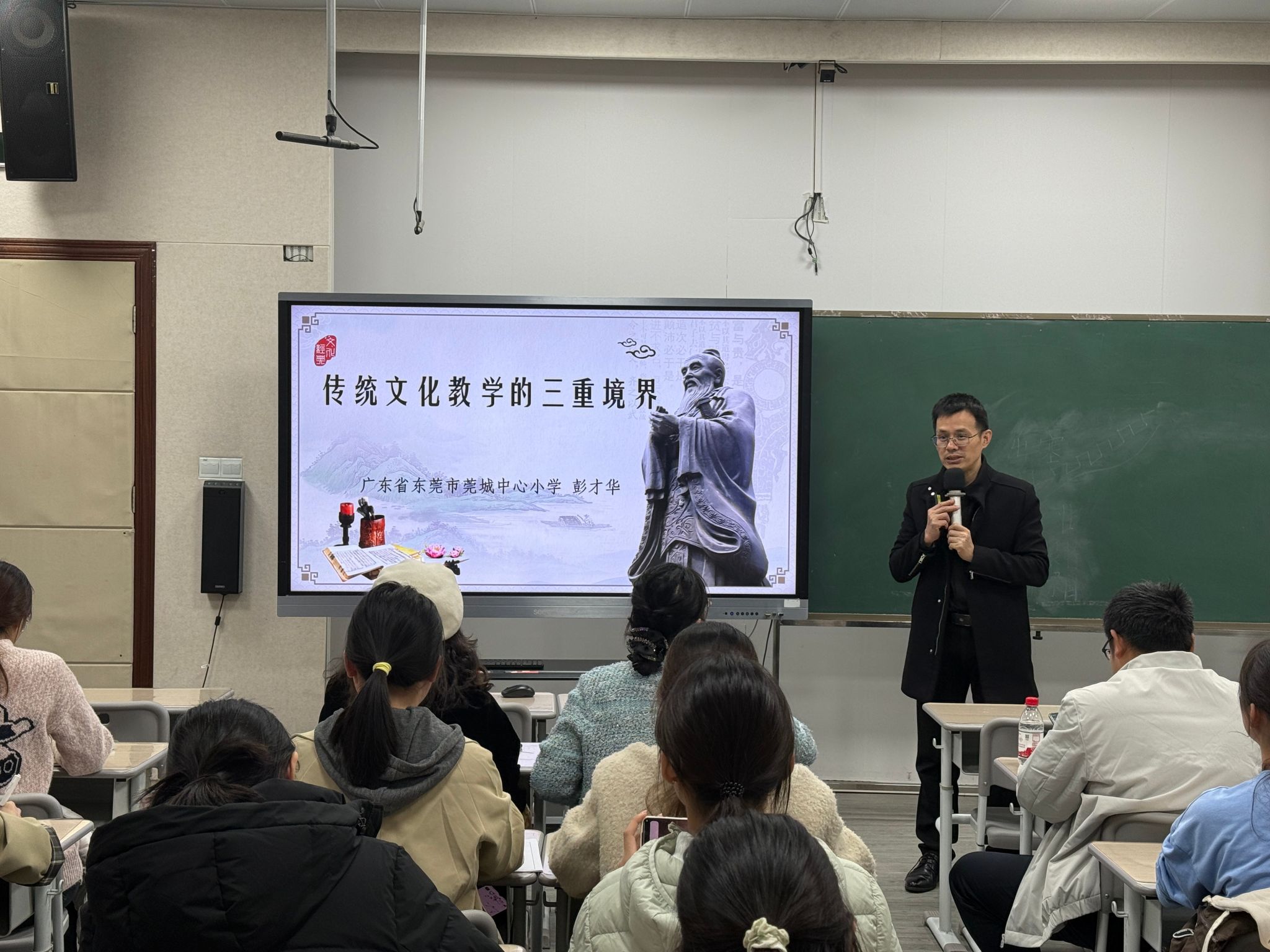 见习的第二站,师生走进东莞莞城中心小学,观摩姚天予老师执教的《出塞》,感受“以声入情”课堂的特色;听取彭才华老师《传统文化教学三重境界》的分享,领悟语文教学“以文化人”的本质。