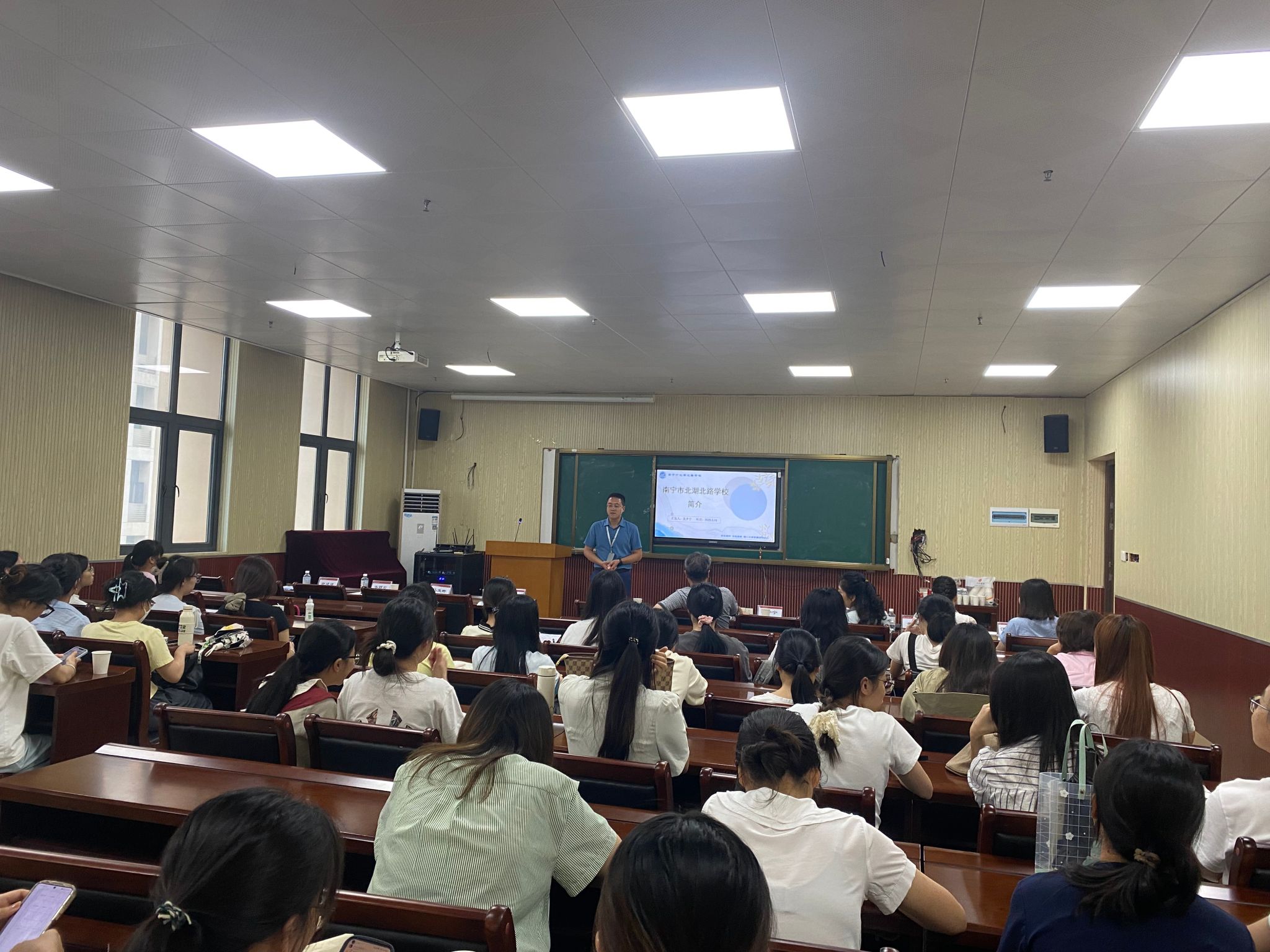 会上,苏学权副书记对北湖北路学校领导老师们的到来表示热烈的欢迎,并介绍学院的办学特色、专业优势、人才培养成果等,希望能与北湖北路学校达成“双选”,建立长期合作关系。期间,南宁市北湖北路学校副校长吴少宁运用图文并茂的PPT,详细讲解学校的历史沿革、办学理念、校园文化、师资力量、教学设施、课程特色、学生活动、薪资待遇、职业发展空间等内容,全方位展示学校的优势和魅力。双方还以“破茧成蝶最后一公里,从理论到实践为成长赋能”为主题开展青年教师与师范生交流活动。在互动问答环节中,同学们就岗位具体工作内容、入职培训、晋升机制等进行提问,北湖北路学校的教师代表们予以充分解答。同学们在会后纷纷将精美的简历投递至用人单位。